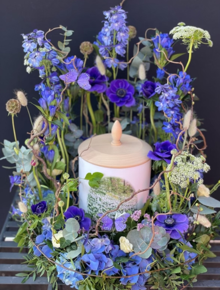 Kistdekoration med bla. blå riddarsporre och vita liljor.